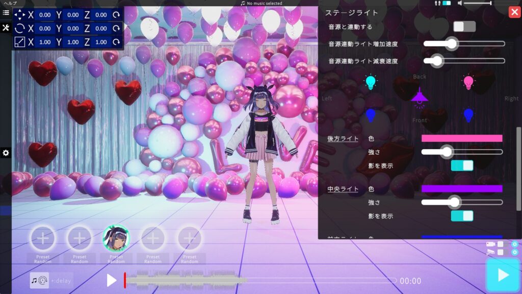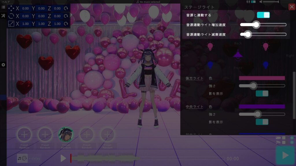 ライトは、中央のVRMモデルを基点に頭上、左右後方、左右前方の計5つを配置しています。