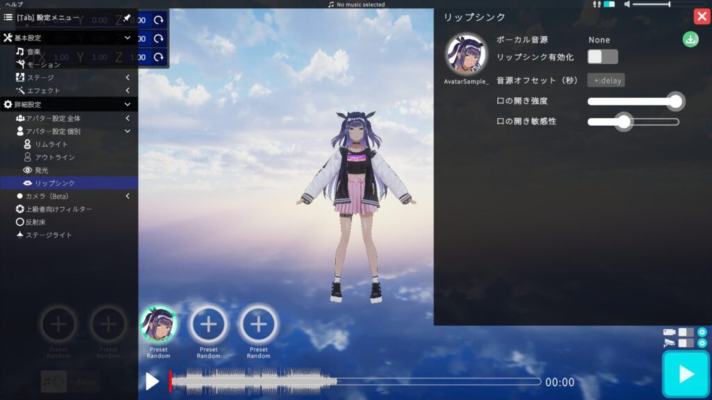 ボーカル音源を読み込むことで、音声に合わせてアバターが自然に口の動きを行います。